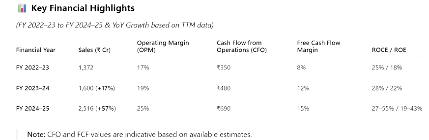 Operating Profit Margin (OPM): Improved from 6.9% in FY23 to 23.96% in FY25, reflecting economies of scale.